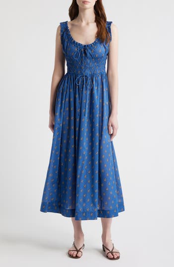 A smocked waist sweetens the silhouette of this sleeveless cotton maxi accented with dainty ties and frilly trim.