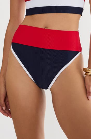 A color-blocked design defines these ribbed bikini bottoms that are ready for some fun in the sun.