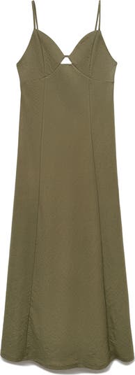 A peekaboo cutout enhances the romance of an Empire-waist dress cut in a flowy A-line silhouette.