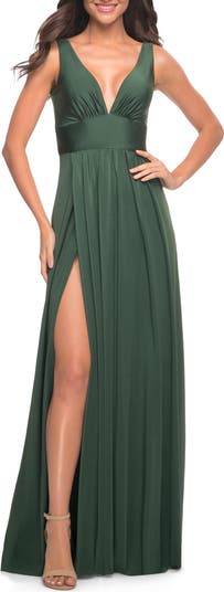Simple and timeless jersey dress with empire waist and deep V neckline. Features a side leg slit and wide straps. Back zipper closure. Dress also comes in black, dark berry, mauve, nude, silver, and white under number 28547. It also comes in hot pink under number 30669.
