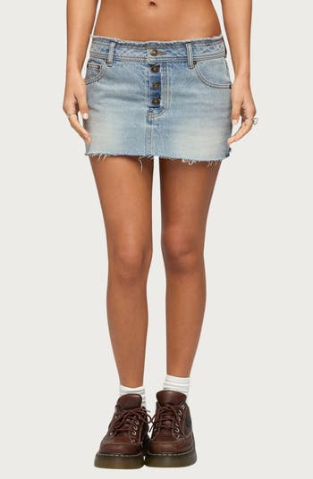 A light-blue wash lends signature style points to a miniskirt cut from distressed nonstretch cotton denim.