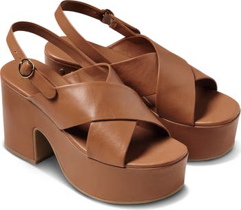 Wide leather straps crisscross over the vamp of a retro-cool slingback sandal lofted by a sky-high platform and block heel. A foam-cushioned footbed with built-in arch support offers all-day comfort.