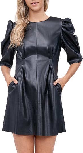 Puff sleeves add drama to an edgy faux leather minidress enhanced by a flattering A-line silhouette, subtle ruching and utilitarian pockets.