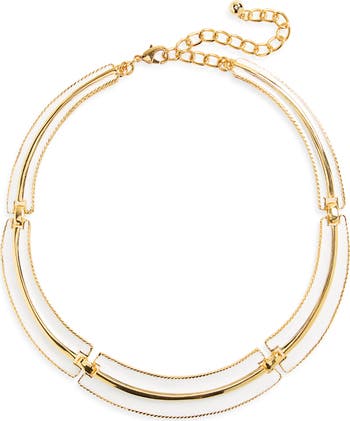 Make a modern statement in this sleek bib necklace fashioned with smooth enamel and gleaming 22-karat gold plate.