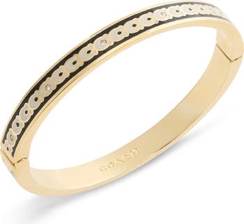 Sparkling crystals illuminate the enameled logo motif of this contemporary-chic hinge bracelet.