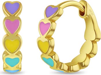 Bright, cheerful, and full of charm, these children’s huggie hoop earrings feature a cascade of rainbow enamel hearts dancing along the front, adding a playful pop of color to every outfit. Crafted from 14k gold over sterling silver, they offer the perfect blend of durability, shine, and comfort for little ears. The smooth huggie design makes them easy to wear all day, while the vibrant heart details bring a whimsical touch kids will love. A sweet and stylish accessory that brings joy with every turn. A small gift box is included with purchase.