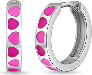 Add some color to your little girl's jewelry collection with these adorable huggie hoop earrings. Crafted from hypoallergenic 925 sterling silver, they are sweet for girls with sensitive skin. Each hoop is beautifully stamped with delicate pink enamel hearts, adding a charming detail. Designed for a secure and comfortable fit, these Huggie Hoops are easy to wear and fun for everyday style or special occasions. A lovely gift for any young fashionista! gift box included with purchase.