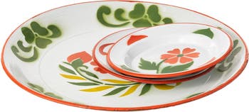 Made from upcycled enamel, this Puebco serving set features a hand painted floral design, making each one unique. Bring a vintage look with a touch of playful color to your home with this serving set. Accompanied with a mesh sling pouch for easy transport and storage. Great for camping, casual summer dining or themed kitchens.*Note: Cannot be used in a microwave oven, an oven, an open flame, or an IH. Due to the nature of the material, unevenness of enamel, peeling, chipping, rust, etc. may be seen. The design will be assorted and cannot be chosen.