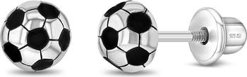 Fun and bold soccer ball screw back earrings that make for a beautiful gift for young athletic girls. The cutest earrings for an active and sporty young girl. Polished earrings created from 925 sterling silver, these earrings are hypoallergenic and safe for sensitive skin. These fun earrings include safety screw backs, that allow the earrings to remain safely in place while she practices for her games. Gift Box included with purchase.