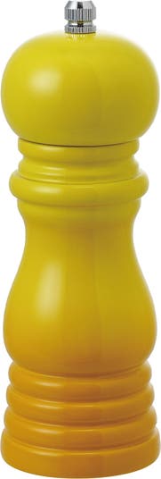 - A charming enameled rubberwood salt/pepper mill in a vibrant yellow finish, perfect for adding a pop of color