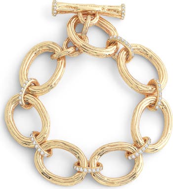 Varisized chain links textured with ridges inspired by the richly grained wood of a forest highlight the delicate crystals glittering across this bracelet plated in 18-karat yellow gold.