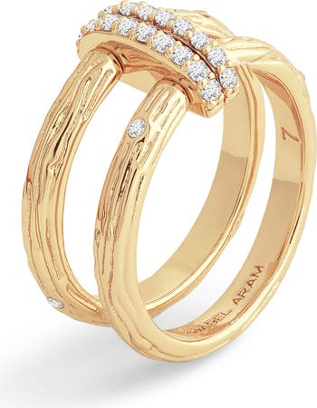 Stacked-illusion bands textured with ridges inspired by the richly grained wood of a forest highlight the delicate crystals centering this ring plated in 18-karat yellow gold.