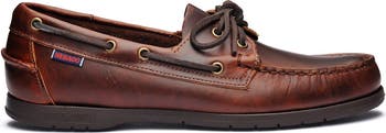 The "Endeavor" boat shoe is built like a true nautical footwear classic: the traditional way. These naturally waterproof, long-lasting, slip-on boat moccasins are made of leather hot stuffed with a rich combination of oils and waxes, and then hand-sewn with meticulous craftsmanship. Captained by the British explorer, navigator, and cartographer, James Cook, the ship is renowned for her exploration of the far side of the world (at least far side from Maine), but interestingly, Cook spent his first commissions creating some of the earliest and most detailed maps of Newfoundland and the St. Lawrence River, just north of Maine and cut from the same cloth in the nautical and sailing communities.The Endeavor boat shoe is conditioned and enhanced by a natural polish that comes to life in this low cut classic canoe moccasin style construction. The boat shoe touts a comfortable leather sock lining, a 360 rawhide lace system and non-marking, anti-slip, siped soles made from a uniquely innovative dark-brown rubber that will provide a dependable grip on deck or on land, in all weather conditions.