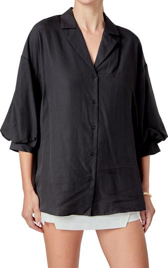 Voluminous three-quarter sleeves frame this billowy woven shirt featuring a notched collar.