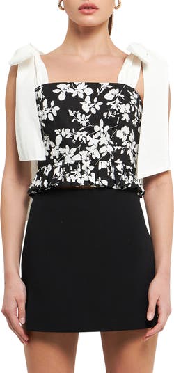 Monochrome blooms enliven this square-neck tank designed with bow-tie straps and a frilled peplum.