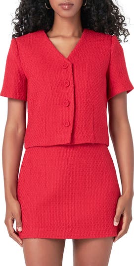 Textural tweed lends a vintage-chic look to this slightly cropped, softly structured V-neck top.