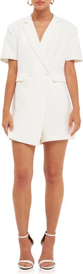 Polished meets charm on this tailored romper designed in a double-breasted silhouette with abbreviated sleeves.