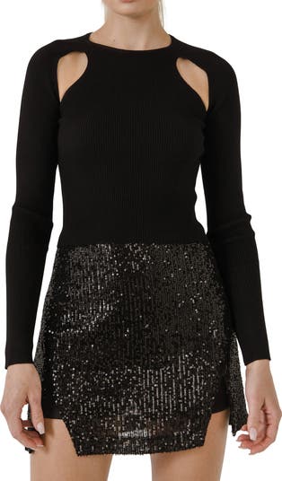 Geometric cutouts at the yoke and a rib-knit finish lend feminine dimension to a fitted top rendered in a rayon blend.