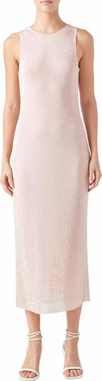 Sparkly rhinestones shine all over this party-ready mesh dress cut in a sleeveless midi silhouette.