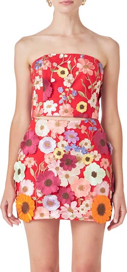 Fanciful embroidered flowers and lace appliqués sprawl across this chic top that shows off your midriff and shoulders.