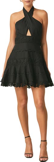 A crossover halter neck creates a peekaboo cutout in this pretty cotton-and-linen minidress featuring a flared lace-trimmed skirt.