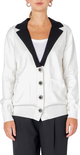 Build out your black-and-white collection with a polished cardigan fixed with bejeweled buttons.
