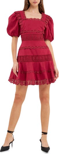 A soft and lustrous blend of cotton and linen form this lace-trimmed dress with a flouncy skirt and puff sleeves.