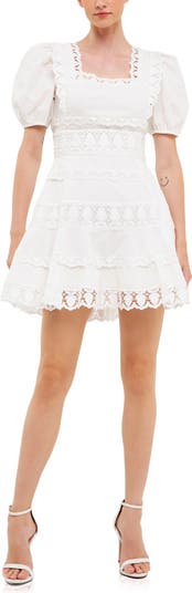 A soft and lustrous blend of cotton and linen form this lace-trimmed dress with a flouncy skirt and puff sleeves.