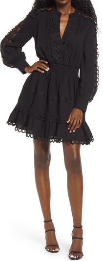 Turn on the charm in this lace-trimmed frock styled with a shapely smocked waist and a flouncy ruffled hem.