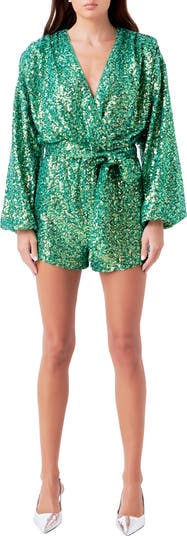 Make a sparkling statement at your next soirée in this sequin romper fixed with billowed sleeves and a matching waist tie.