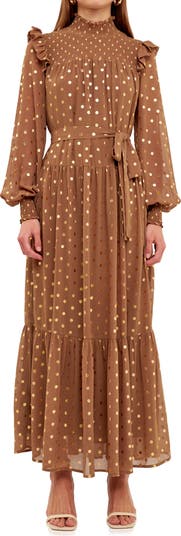 Shimmering metallic dots illuminate this flowy chiffon maxi designed with smocked details and a defining waist tie.