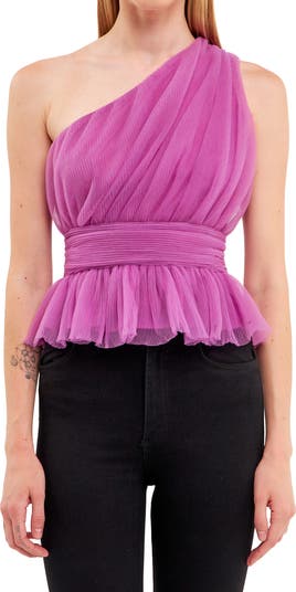Textured tulle creates an elegant draped effect on this one-shoulder top complete with a figure-flattering cinched waist and ruffle hem.