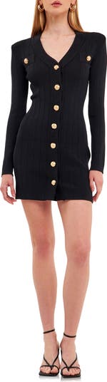 Shiny golden buttons pop on this ribbed sweater-dress cut to skim your curves and finished with a commanding shoulder silhouette.