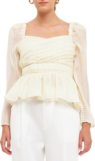 Sheer sleeves frame this pleated blouse punctuated with a flouncy peplum.