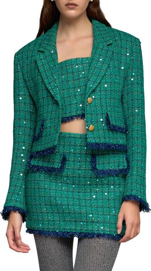Feathery fringed edges trim this tactile tweed jacket covered in polished plaid with glittery sequins.