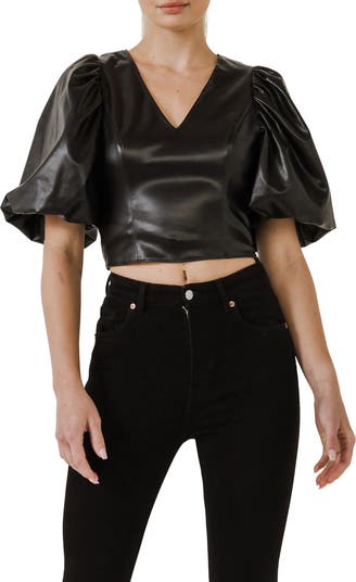 Sugar and spice play nice in this supple faux-leather top styled with exuberantly outsized sleeves and an abbreviated length.