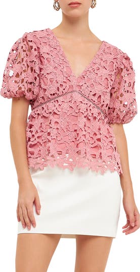 Full of romantic charm, this floral-lace top features puff sleeves and a flouncy finish.