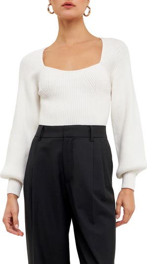 An effortlessly romantic rib-knit top has a low square neckline and long bishop sleeves that flow gracefully with every gesture you make.