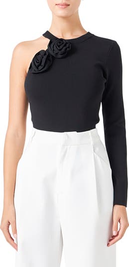 Two twisted roses dot the neckline of this one-shoulder, single-sleeve top cut from a stretchy ribbed knit that contributes to this style's sleek fit.