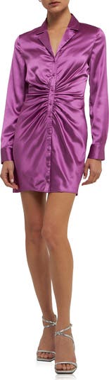 Turn heads on your next night out in this ruched shirtdress sewn from burnished satin.