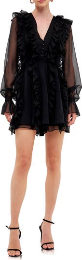 Decadent ruffles playfully adorn this airy chiffon minidress framed by billowy, sheer long sleeves.