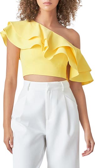 Billowy ruffles grace the one-shoulder neck of a striking crop top.