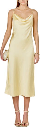 A cowl neck creates feminine drape on a figure-grazing midi dress rendered in smooth and luxurious satin.