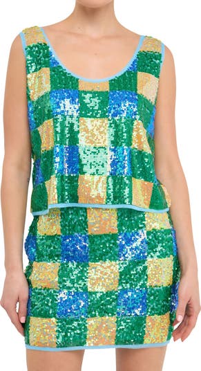 A check pattern made entirely of sparkling sequins elevates the glam factor of this party-ready tank.