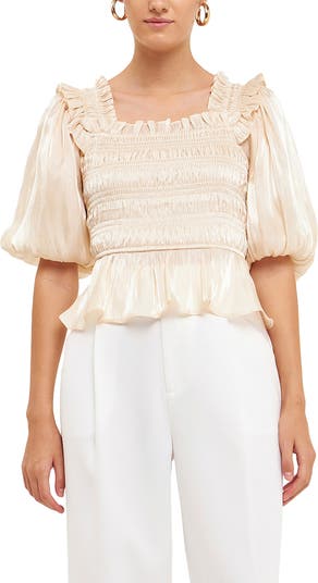 A rich sheen elevates this smocked blouse designed with puff sleeves and a frilly peplum.