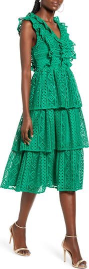 Fanciful frills and lacy eyelets detail this charming sleeveless midi that's ideal for any occasion.