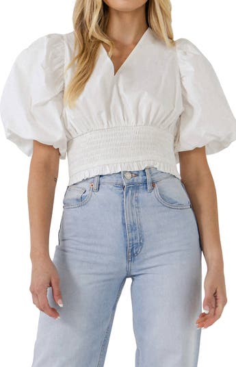 Darling puff sleeves frame this cropped V-neck top punctuated with a shaping smocked waist.