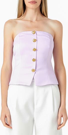Gleaming golden buttons define this polished top featuring a shoulder-baring strapless neckline.