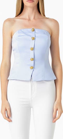 Gleaming golden buttons define this polished top featuring a shoulder-baring strapless neckline.
