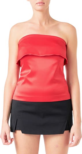 A flouncy neckline lends eye-catching appeal to this strapless top crafted from rich satin.